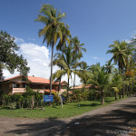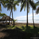 When you first arrive at the beach, the sandy area is huge, and there’s tons of shady parking under the palms. We found it deserted in mid day, but I’d guess that many people come from town to hang out on the weekends and holidays. The waves, at mid-tide, were closing out at small to medium size and it wasn’t worth it to paddle out. Apparently high tide is better. The beach is broad and flat, fairly dark sand, but not as black as other beach guides in Costa Rica report. There’s a large bar here that looks like it would be a fun spot during the weekends at night.