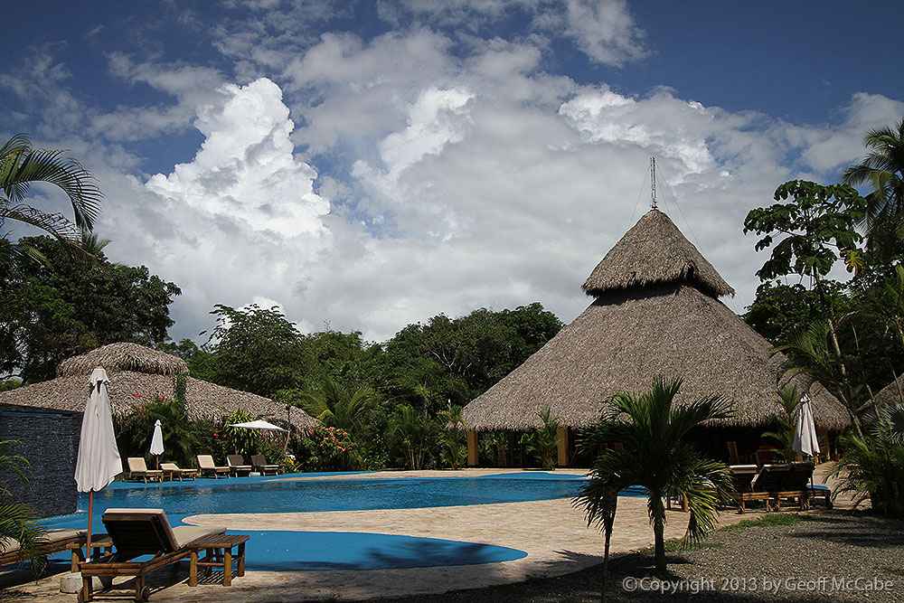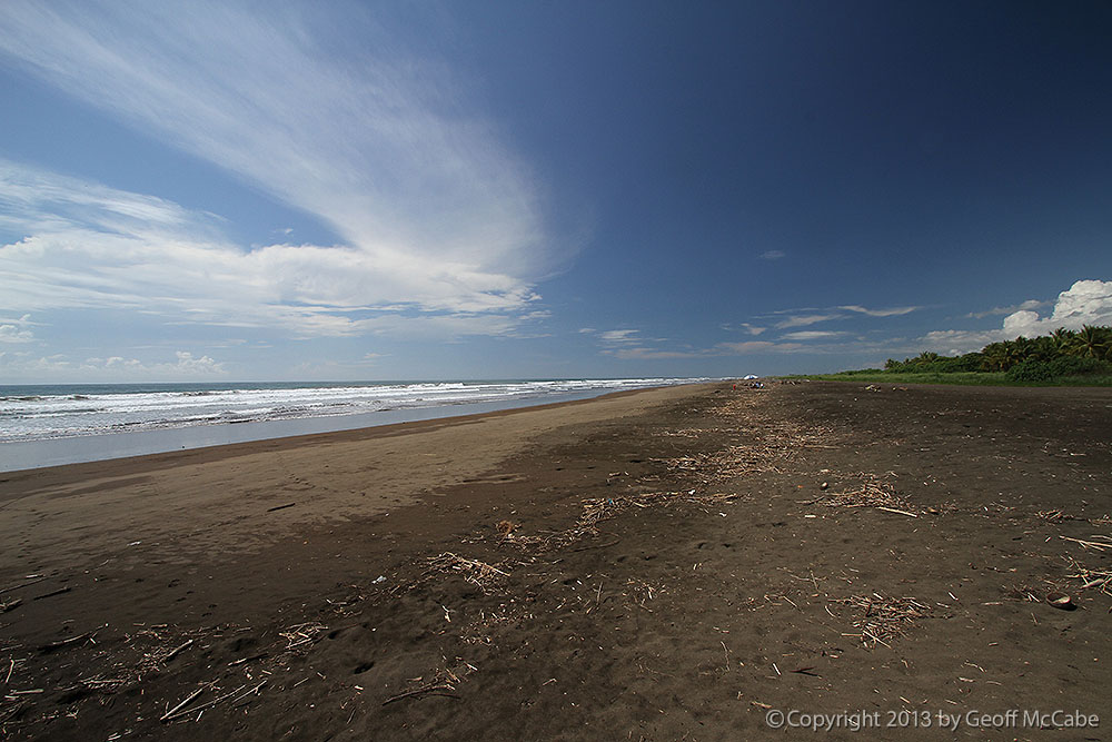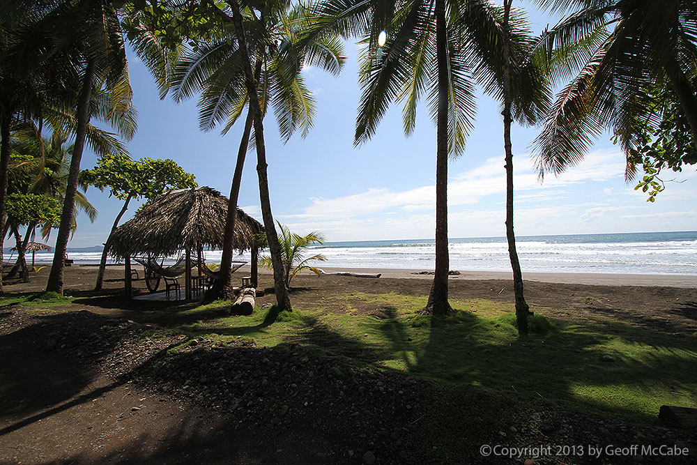 When you first arrive at the beach, the sandy area is huge, and there’s tons of shady parking under the palms. We found it deserted in mid day, but I’d guess that many people come from town to hang out on the weekends and holidays. The waves, at mid-tide, were closing out at small to medium size and it wasn’t worth it to paddle out. Apparently high tide is better. The beach is broad and flat, fairly dark sand, but not as black as other beach guides in Costa Rica report. There’s a large bar here that looks like it would be a fun spot during the weekends at night.